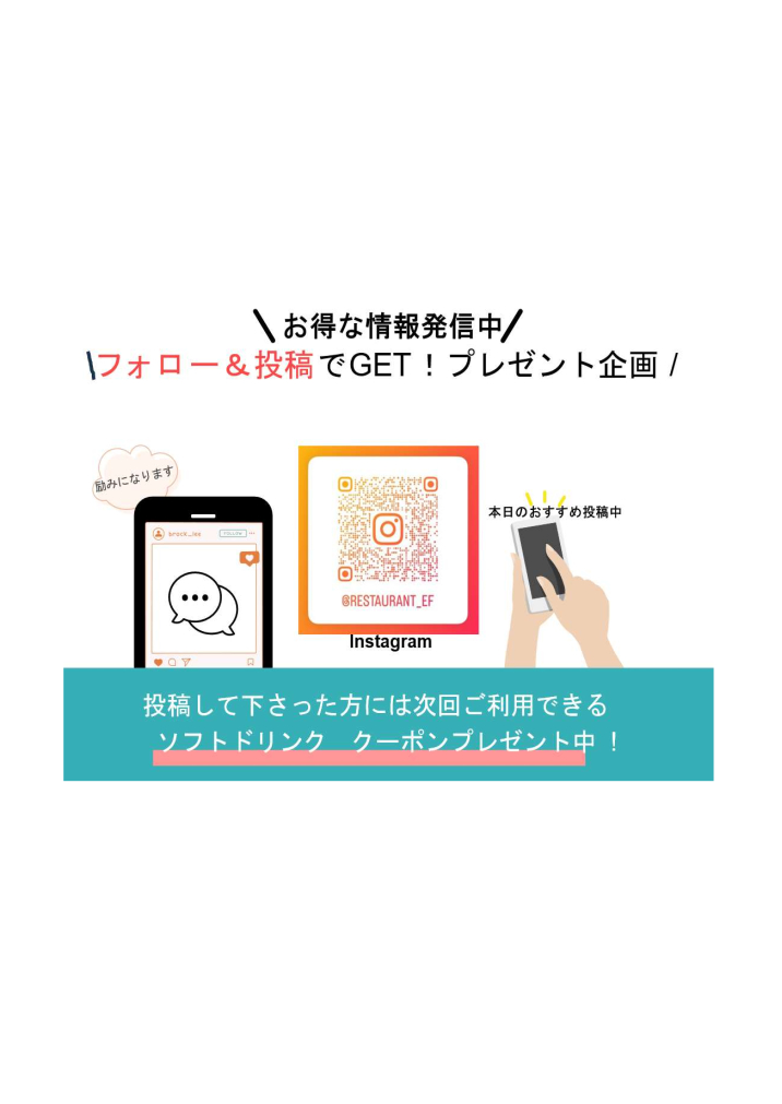 フォロー&投稿でプレゼント企画実施中♪ 執筆者 efzone | 3月 24, 2026 | Uncategorized | コメント0件 当店のインスタグラムをフォロー&投稿で 当店のみで使用できる 「ソフトドリンク クーポン」プレゼント♪ 皆様のフォロー&投稿お待ちしております♬ コメントを送信 コメントをキャンセルメールアドレスが公開されることはありません。 ※ が付いている欄は必須項目ですコメント ※ 名前 ※ メール ※ サイト 次回のコメントで使用するためブラウザーに自分の名前、メールアドレス、サイトを保存する。 上に表示された文字を入力してください。 Δ