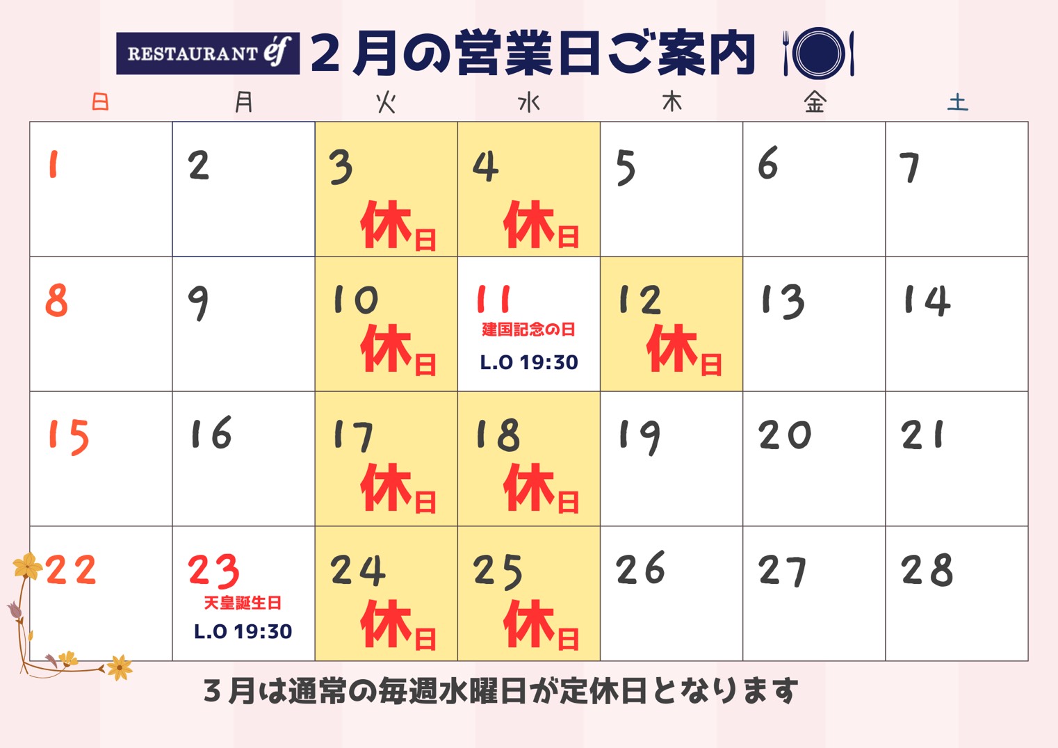 レストラン2月の定休日について 執筆者 efzone | 2月 3, 2026 | Uncategorized | コメント0件 2月の定休日は火曜日・水曜日となります。(11日水曜日は祝日営業、代替で12日木曜日が休業)ご注意ください。 コメントを送信 コメントをキャンセルメールアドレスが公開されることはありません。 ※ が付いている欄は必須項目ですコメント ※ 名前 ※ メール ※ サイト 次回のコメントで使用するためブラウザーに自分の名前、メールアドレス、サイトを保存する。 上に表示された文字を入力してください。 Δ